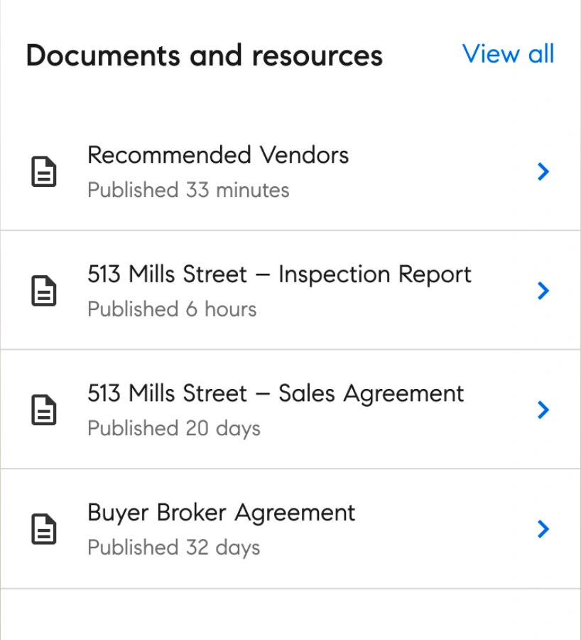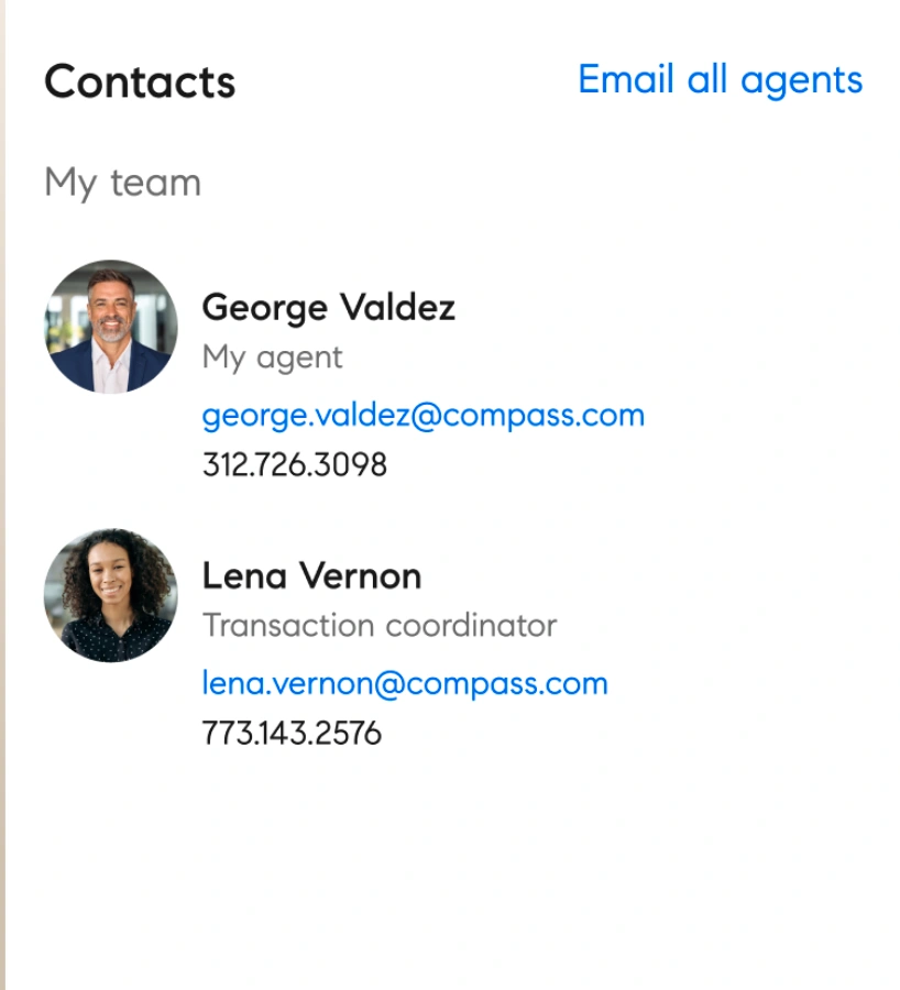 Access contact information for all parties involved in your transaction, including your agent team, loan officer, and closing partners like title and escrow.